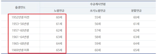 1952년생 이전의 경우는 국민연금을 만 60세부터 수령이 가능하지만 1969년생 이후의 경우는 만 65세부터 연금을 지급받게 됩니다.